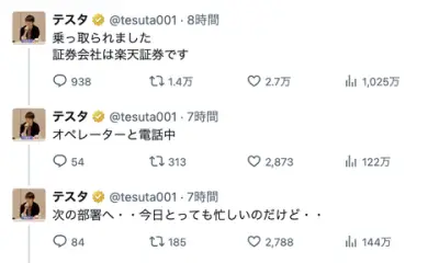 【悲報】著名投資家のテスタさん、楽天証券口座を乗っ取られてしまう
