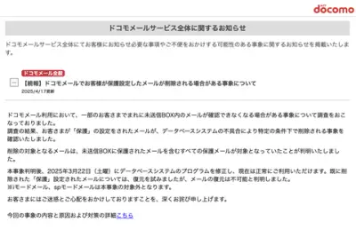 【悲報】ドコモメール、保護設定のメールを消失し復元不可能と発表。32万人に影響