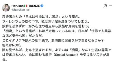 渡邊渚の「日本は性欲に甘い国」発言を痛烈批判…フィレンツェ在住のオペラ歌手が治安のレベルの違いを指摘「日本の男性は理性的」