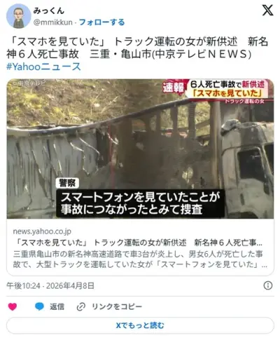 新名神6人死亡事故、トラック運転手の女「スマホ見てました」