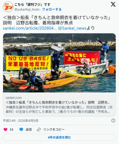 辺野古事故船長「亡くなった生徒はライフジャケットをちゃんと着てなかった」