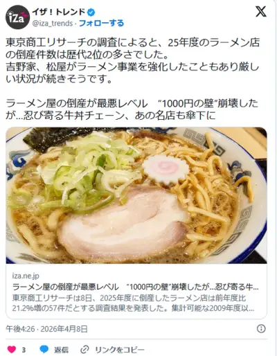 ラーメン屋の倒産が最悪レベル “1000円の壁”崩壊したが…忍び寄る牛丼チェーン、あの名店も傘下に