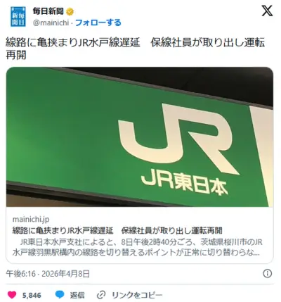 【茨城】線路に亀挟まりJR水戸線遅延 保線社員が取り出し運転再開