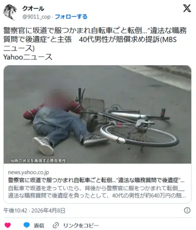 【大阪】警察官に坂道で服つかまれ自転車ごと転倒…“違法な職務質問で後遺症”と主張 40代男性が賠償求め提訴