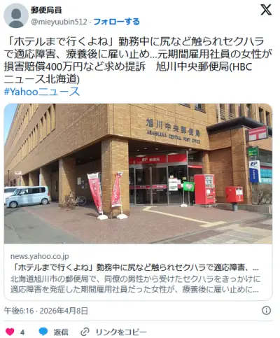 【旭川】郵便局勤務中に手マンされたりホテル誘われたりして適応障害になった女性が提訴