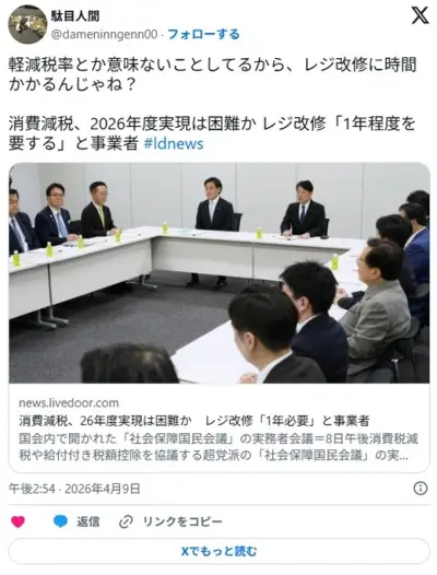 高市早苗「すまん、減税約束したけどレジ改修がやっぱりネック🥺」