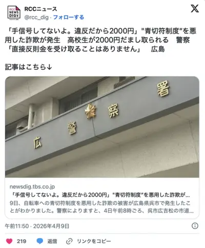 【広島】自転車の「青切符」制度を悪用、警察のふりして高校生から2000円だまし取る事件が発生 呉市