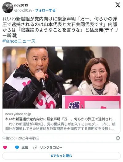 れいわ新選組が党内向けに緊急声明「万一、何らかの弾圧で逮捕されるのは山本代表と大石共同代表です」