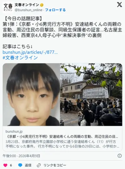 【文春砲】行方不明男児、両親は再婚で母の連れ子 当日の父「家でゴタゴタが…」と欠勤