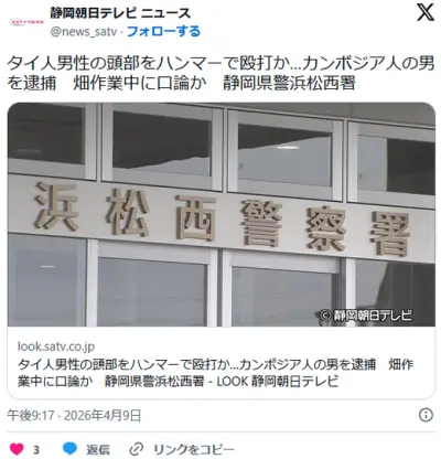 タイ人男性の頭部をハンマーで殴打か…カンボジア人の男を逮捕 畑作業中に口論か 静岡県警浜松西署