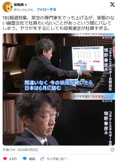 TBS報道特集、「日本は詰む」発言のコネクトエネルギー合同会社、去年できたばかりの新鋭企業だった