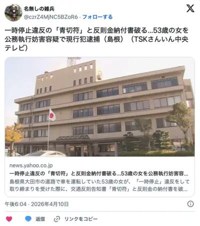 一時停止違反の「青切符」と反則金納付書破る…53歳の女を公務執行妨害容疑で現行犯逮捕