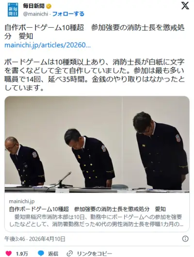 自作ボードゲーム10種超 参加強要の消防士長を懲戒処分
