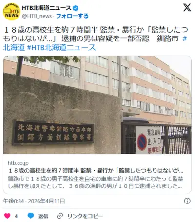 【北海道】18歳の高校生を約7時間半 監禁・暴行か「監禁したつもりはないが…」 逮捕の36歳漁師の男は容疑を一部否認 釧路市