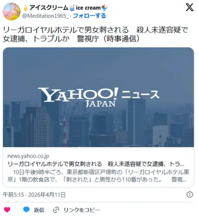 【東京・新宿】リーガロイヤルホテルで男女刺される=殺人未遂容疑で女逮捕、トラブルか