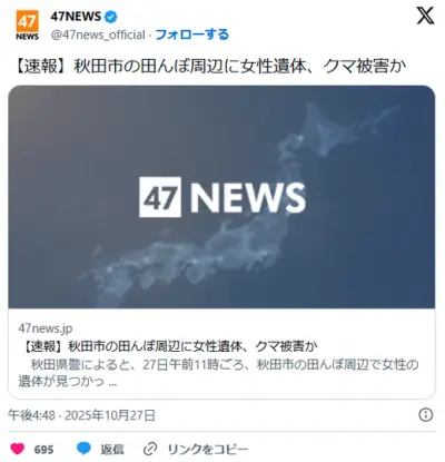 【(・(ェ)・)】秋田市の田んぼ周辺に女性遺体、クマ被害か
