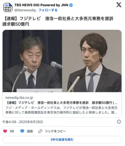 【フジテレビ】港浩一前社長と大多亮元専務を請求額50億円で提訴へ