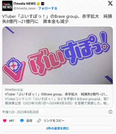 【悲報】VTuber業界大手2社に次ぐ3番手のBrave group、純損失21億5645万3000円