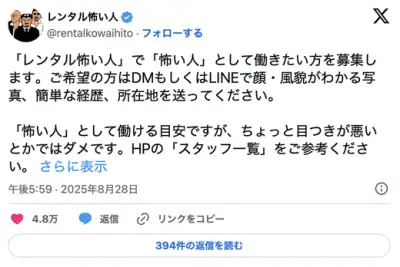 【画像】 ツイッターで「レンタル怖い人」がバズってしまうwww