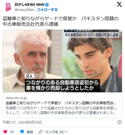 【茨城】盗難車と知りながらヤードで保管か パキスタン国籍の中古車販売会社代表ら逮捕