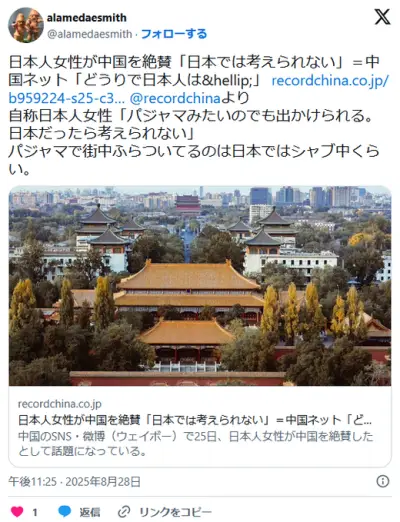 日本人女性、中国を絶賛。「中国はパジャマで外に出られる。電車で笑える。本当に自由です」