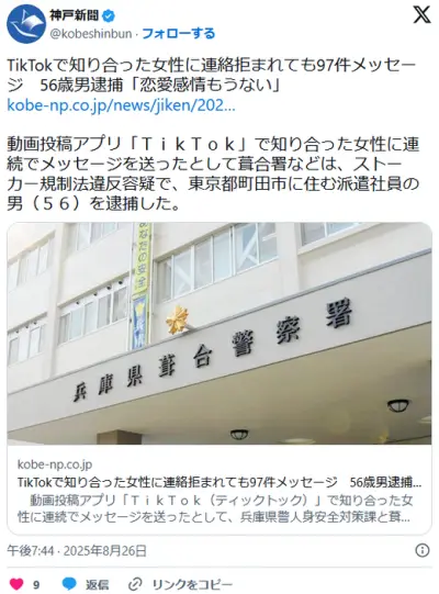 【兵庫】TikTokで知り合った神戸市の女性に連絡拒まれても97件メッセージ、ストーカー容疑で東京都の56歳男を逮捕「恋愛感情もうない」