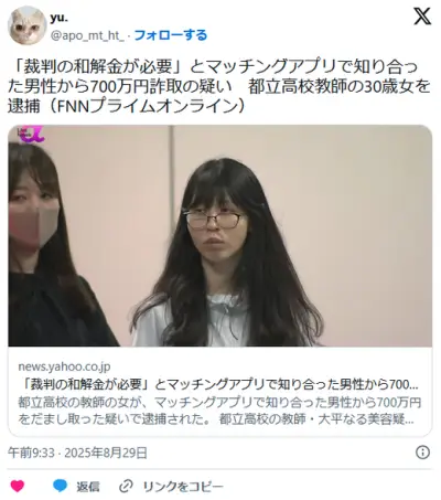 「裁判の和解金が必要」とマッチングアプリで知り合った男性から700万円詐取の疑い 都立高校教師の大平なる美容疑者(30)逮捕
