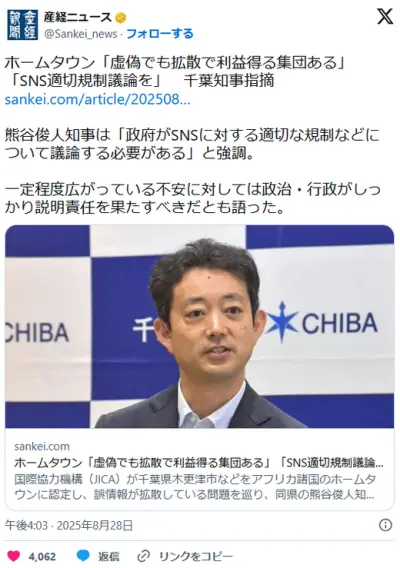 千葉県知事「人々が反応するデマを大きく拡散させ利益を得る集団がある。政府は適切なSNS規制議論を」
