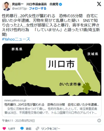 【川口市】トルコ国籍の17歳少年逮捕 20代女性に刃物を見せて脅迫、不同意性交