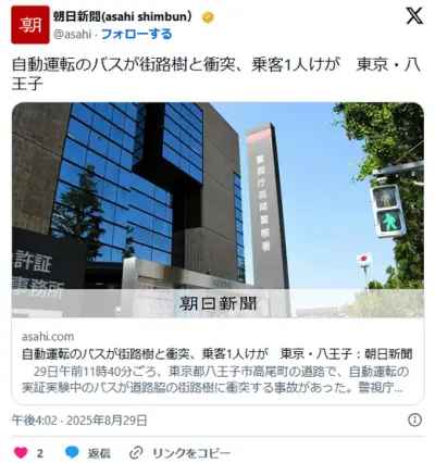 自動運転のバスが街路樹と衝突、乗客1人けが 八王子市高尾