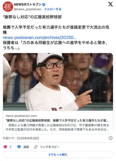 【謎】広陵に推薦で入学予定だった中学生たちが続々辞退し進路変更してる模様