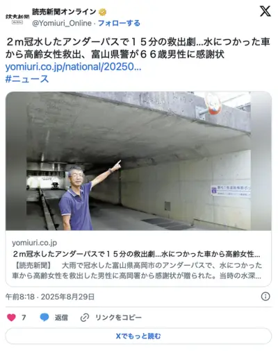片手で標識の支柱、もう片方の手で車を掴み、車が水に沈まぬよう引き上げた男性(66)に感謝状