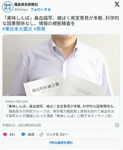 「美味しんぼ」鼻血描写、被ばく肯定意見が多数...科学的な因果関係なし、情報の根拠精査を (福島医大)