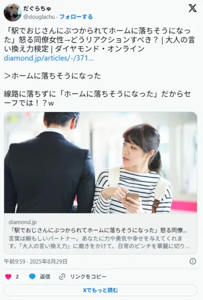 「駅でおじさんにぶつかられてホームに落ちそうになった」怒る同僚女性→どうリアクションすべき? (コラムニスト)