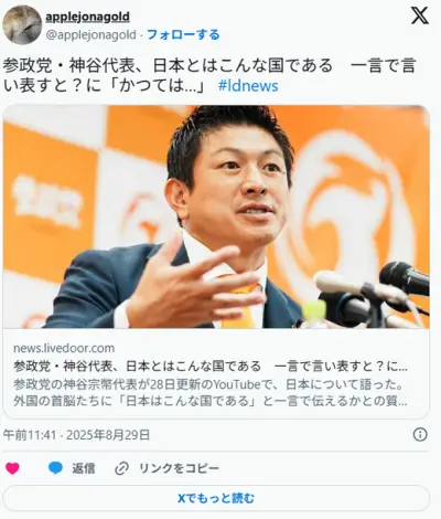 「もう一度『侍の国・ジャパン』を復活させたい」神谷宗幣代表が持論