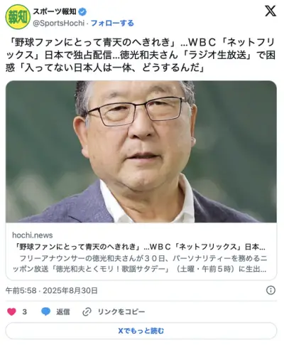 【フリーアナ】徳光和夫さん困惑 WBC「ネットフリックス」日本で独占配信…「入ってない日本人は一体、どうするんだ」