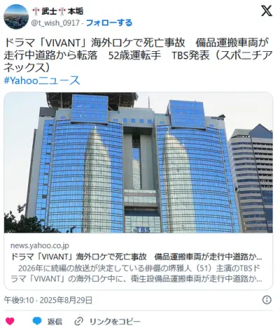 ドラマ「VIVANT」海外ロケで死亡事故 備品運搬車両が走行中道路から転落 TBS発表