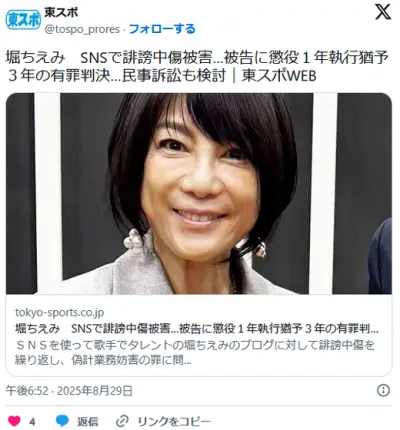 【芸能】堀ちえみ SNSでの誹謗中傷の被告に懲役1年執行猶予3年の有罪判決 被告人は生活保護受給も「民事訴訟も検討」