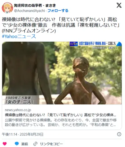 裸婦像は時代に合わない? 「見ていて恥ずかしい」高松で“少女の裸体像”撤去 作者は抗議「裸を軽蔑しないで」