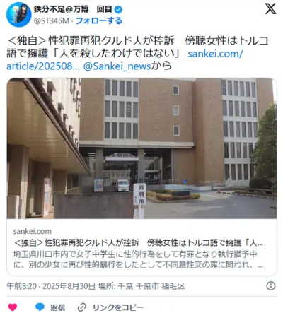 <独自>性犯罪再犯クルド人が控訴 傍聴女性はトルコ語で擁護「人を殺したわけではない」
