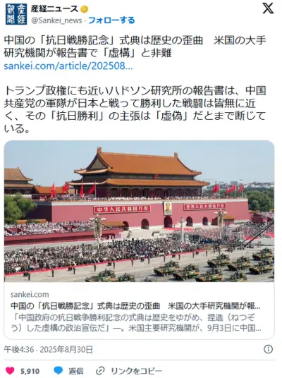 中国の「抗日戦勝」式典は歴史の歪曲「虚構」と米国が非難 中国共産党軍が日本に勝利した戦闘は皆無