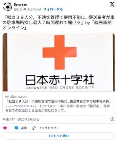 献血39人分、不適切管理で使用不能に…搬送業者が車の駐車場所探し最大7時間遅れで届ける