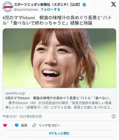 歌手のhitomi、味噌汁の具材で10歳の長男に「味噌汁にキャベツ合わないんだよ、ほうれん草とかだと思う」言い返されバトル