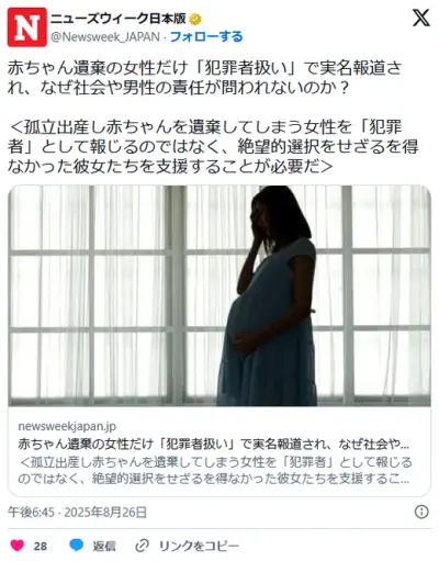 赤ちゃん遺棄の女性だけ「犯罪者扱い」で実名報道され、なぜ社会や男性の責任が問われないのか? (西村カリン氏)