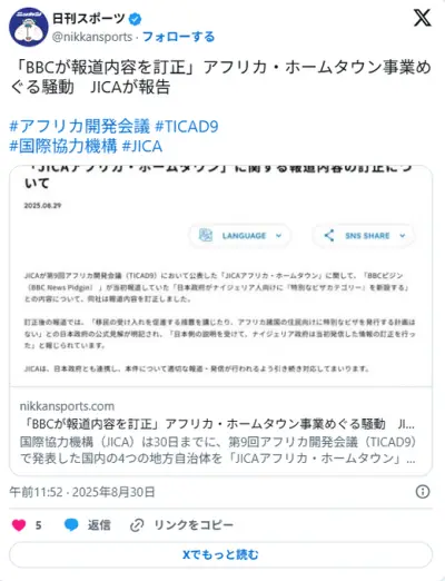 【ホームタウン】「BBCが報道内容を訂正」アフリカ・ホームタウン事業めぐる騒動 JICAが報告
