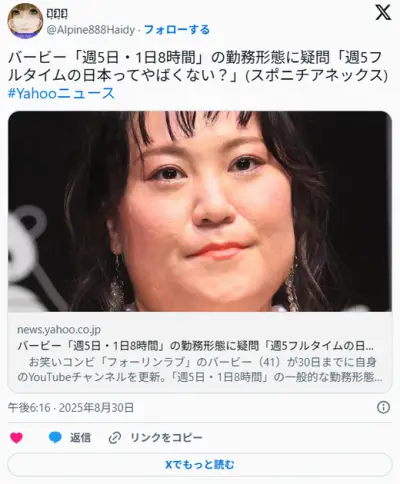 バービー、「週5日・1日8時間」の勤務形態に疑問「週5フルタイムの日本ってやばくない?」