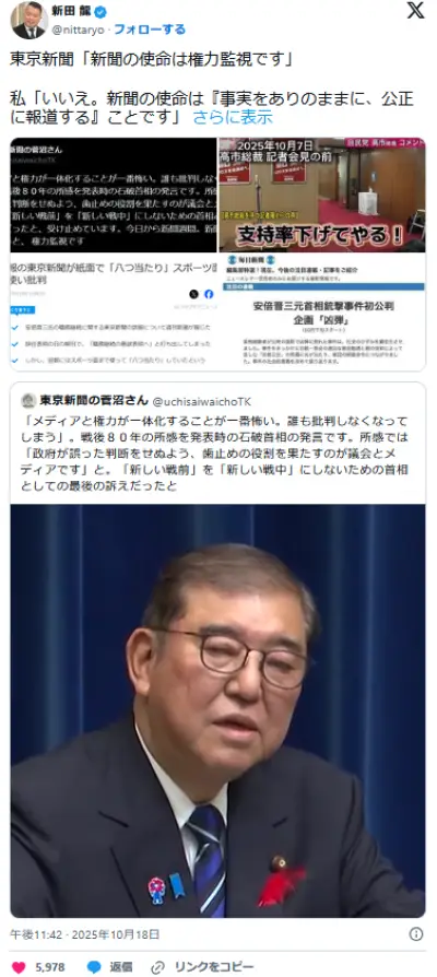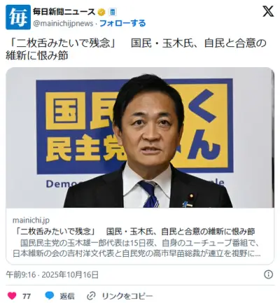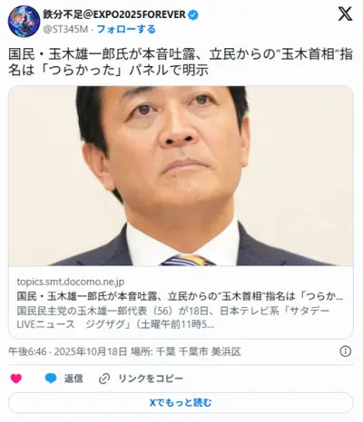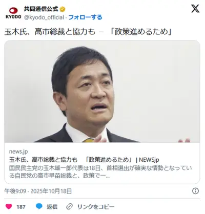 【速報】 国民・玉木代表 「政策を進めるため、高市氏に協力する」
