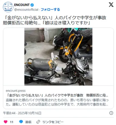 「金がないから払えない」人のバイクで中学生が事故 賠償拒否に母絶句…「娘は泣き寝入りですか」
