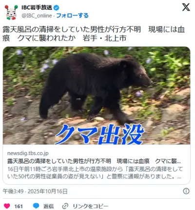【岩手】露天風呂の清掃をしていた男性が行方不明 現場には血痕 クマに襲われたか 北上市