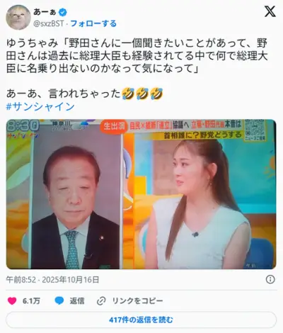 ゆうちゃみ「野田さんは過去に総理大臣も経験されてる中でなんで総理大臣に名乗り出ないのかなぁって」